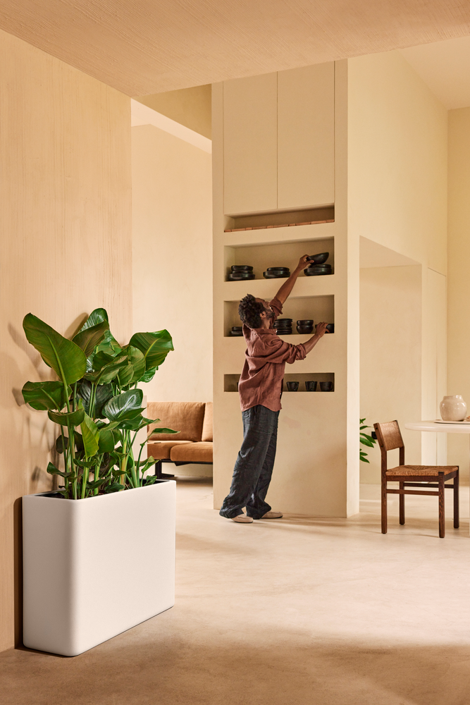Du suchst das perfekte Pflanzgefäß für einen grünen Raumteiler in deinem Garten oder Haus? Dann ist der june brick divider die perfekte Wahl, ein robustes Pflanzgefäß mit modernen und klaren Linien. Kombiniere diesen Topf mit Gräsern oder bunten Pflanzen und genieße das viele Grün in deinem Garten oder Haus. Der Pflanzbehälter ist durch seine integrierten Rollen an der Unterseite leicht zu verschieben. Ein erhöhter Boden sorgt dafür, dass du nicht den ganzen Topf mit Erde füllen musst. Willst du trotzdem garantierte Stabilität? Du kannst den unteren Teil des Topfs mit Sand befüllen. Dieser Teil kann mit dem Stöpsel verschlossen werden, damit der Sand im Topf bleibt. Möchtest du den Blumentopf im Freien verwenden? Dann Vergiss nicht, die Markierung auf der Innenseite des Topfes an dem erhöhten Boden zu durchzubohren. Diese sorgen dafür, dass überschüssiges Wasser durch den Sand nach unten und aus dem Stöpsel abgeleitet wird. Denke aber daran, dass der Topf nicht mehr im Innenbereich verwenden werden kann, sobald das Loch hineingebohrt wurde.